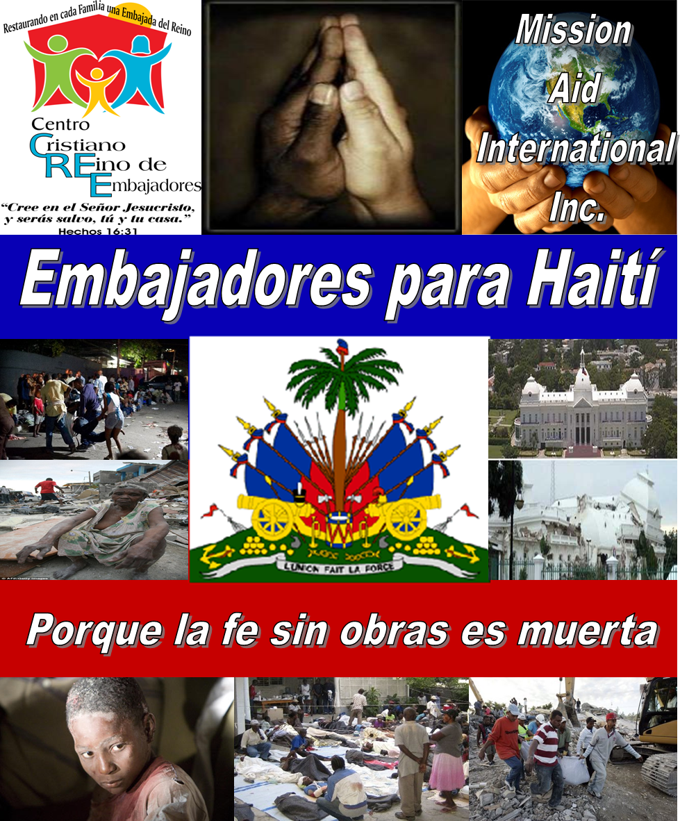 Nuestro propósito es ayudar al Ministerio Mission Aid International, Inc. a canalizar ayuda médica y económica para Haití. Mission Aid International, Inc. (M.A.I. Inc.) es un ministerio que hemos conocido hace ya unos tres o cuatro años, conocemos y damos fe de su servicio al Señor en Haití. M.A.I. Inc. es un grupo de Médicos cristianos que han aunado sus esfuerzos para evangelizar en Haití llevando también ayuda humanitaria. Parte de su visión es levantar un Hospital para niños con sala de parto para atender a nuestros hermanos haitianos. En esta ocasión serán para Centro Cristiano Reino de Embajadores, Inc. nuestro enlace con Haití, y nosotros seremos para ellos un centro de acopio. Este es tiempo para la iglesia apostólica actuar como tal llevando el mensaje del Evangelio del Reino con todo su poder a la nación de Haití. Haití necesita hoy del amor, la provisión, la sanidad, la restauración y la resurrección que solo a través del Espíritu Santo se puede dar o recibir. Ayúdanos a ayudar, no solo con tu oración sino que también con tus obras. Recuerda que la fe sin obras es muerta en sí misma.