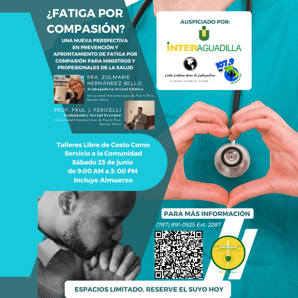 Como Pastor de una congregación, he experimentado lo difícil que puede ser el cuidado de una grey; en especial cuando ocurren eventos que afectan a todos en la congregación, distanciándonos a unos de los otros, como en el caso de la pandemia. Hemos pasado momentos muy difíciles en los que los Profesionales de la Salud y Pastores han tenido que cuidar de otros, mientras ellos mismos sufren de las mismas situaciones de que aquellos que desean ayudar. En este contexto histórico, necesitamos equiparnos y equipar a los demás. Por esto, la Universidad Interamericana de Puerto Rico, Recinto de Aguadilla y el Rector, Dr. Élie Agésilas, han decidió abrir las puertas de nuestro Recinto para ofrecer un taller que prevenga y atienda esta necesidad. Nos gustaría que comparta la información del mismo en sus redes sociales y con colegas o profesionales a quienes esta información les sea valiosa: