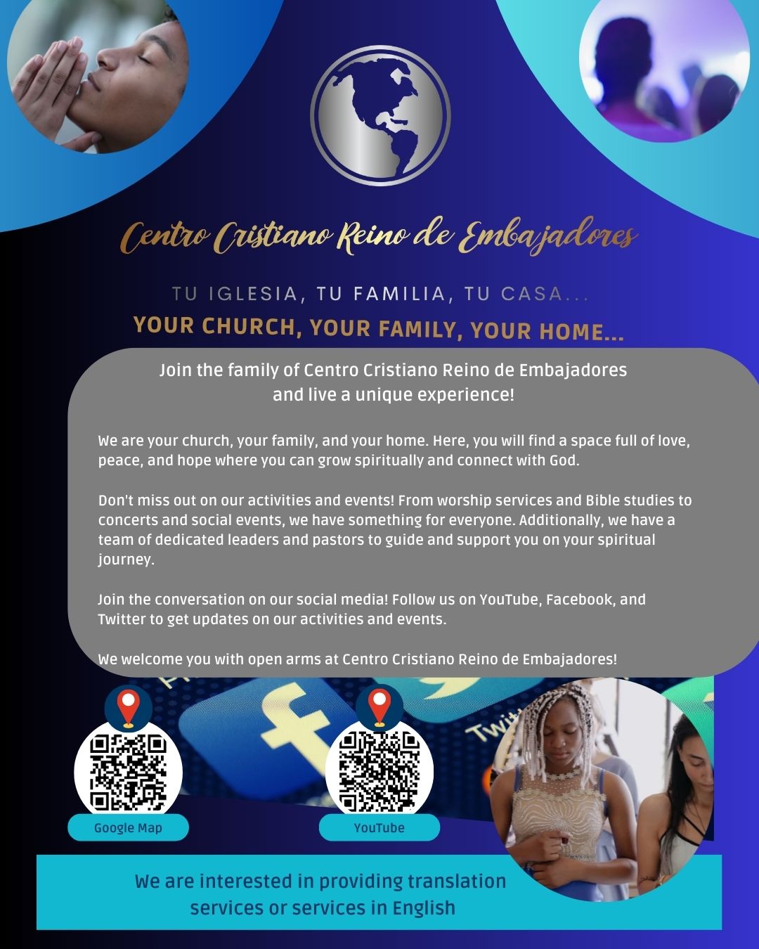 Join the conversation on our social media! Follow us on YouTube, Facebook, and Twitter to get updates on our activities and events. Use our hashtags: #CentroCristianoReinoDeEmbajadores #TuIglesiaTuFamiliaTuCasa to join the conversation and share your experiences with us.