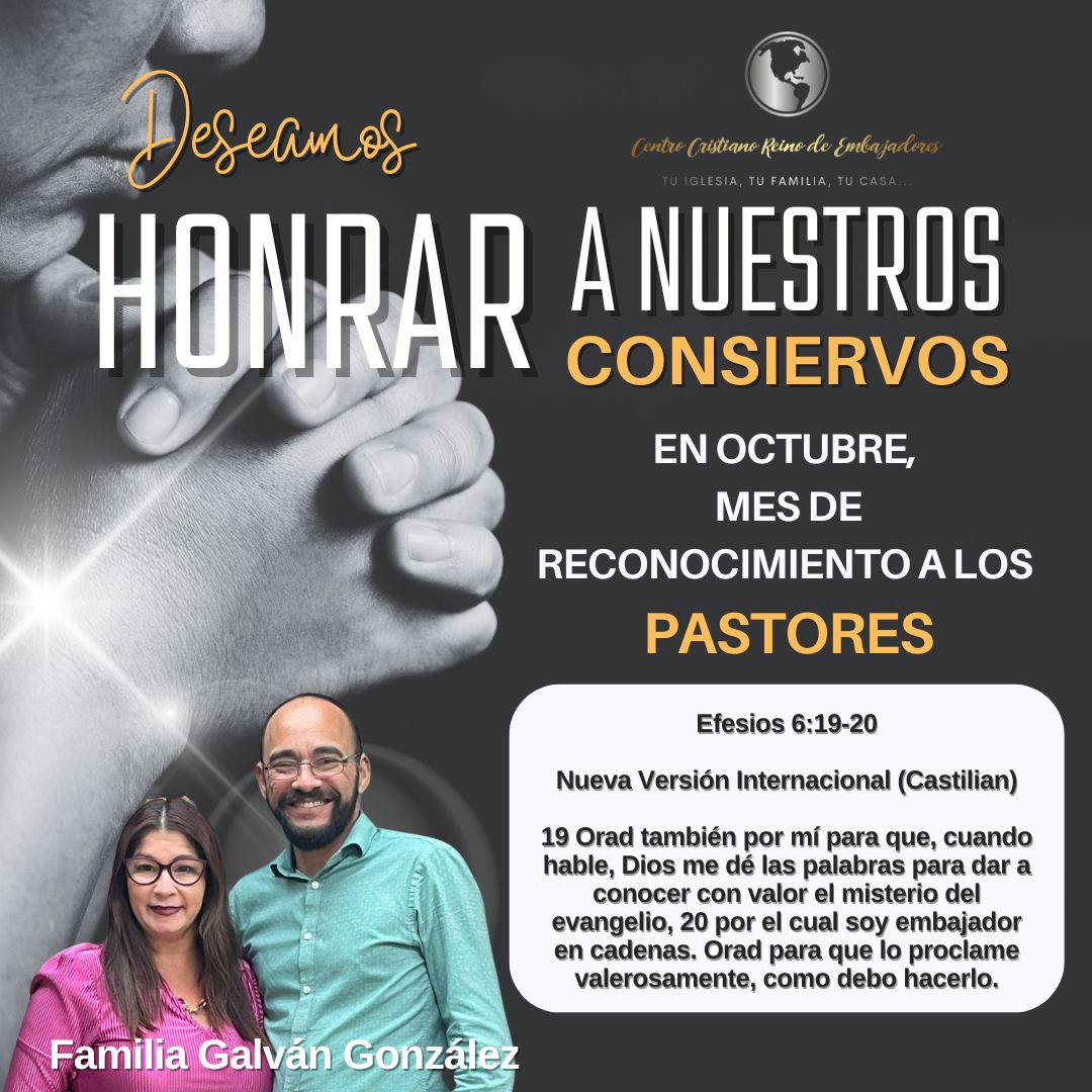 En este mes de octubre, la Pastora Janette González y el Apóstol Jaime B. Galván desean felicitar a todos nuestros consiervos pastores y pastoras, verdaderos embajadores de Cristo, por su incansable labor en el ministerio. 🙏